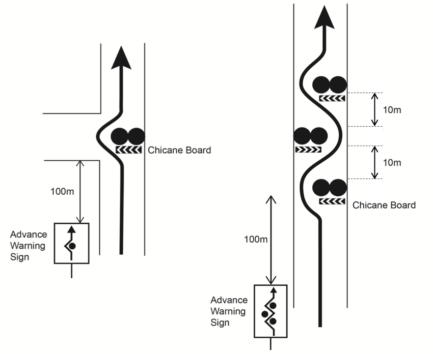 Området mellom første gule varselskilt og siste beige skilt med tre tversgående striper
